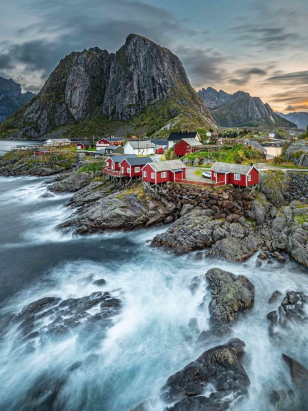 Diese Fischerhütten (Rorbuer) in Hamnøy auf den Lofoten liegen besonders pittoresk vor dem dem mächtigen Mount Olstinden. Morgens zum Sonnenaufgang bietet sich hier oft ein fantastisches Licht.